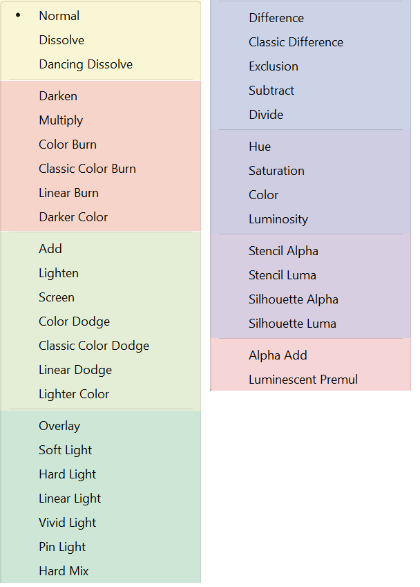 - Colour: Adopts the hue and saturation of the blend layer while retaining the brightness of the base layer.